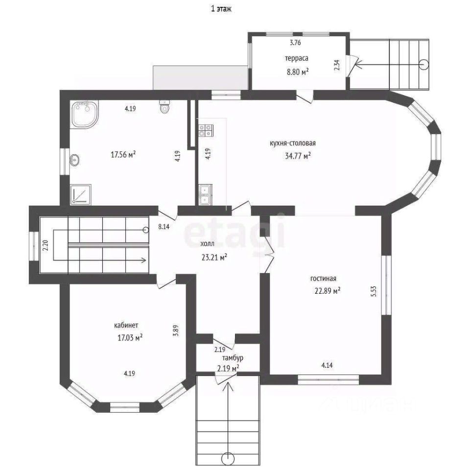 1 этаж: кухня-столовая, гостиная, гостевая спальня, сс/у душевая.