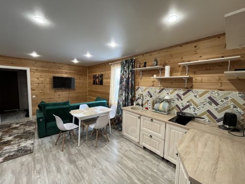 Дом со всеми удобствами, сдается с мебелью, две спальни в одной кровать с набором мебели... в другой раскладнойш диван, в комнате-студии ещё два раскладных дивана, телевизор, в коридоре огромные шкафы иея, в студии кухонная мебель телевизор, холодильник, эл плита индукционная... отдельная ванная комната с окном (душевая кабинка, раковина) отдельный туалет (унитаз, раковина, бойлер, стиральная машина)